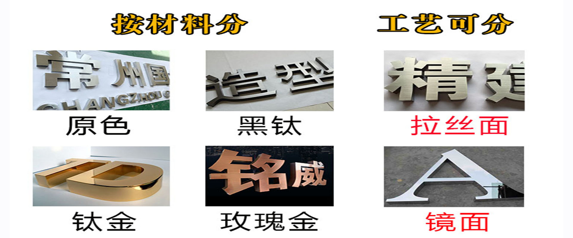 不锈钢材质可分为原色、钛金、玫瑰金、黑钛,工艺可分拉丝面和镜面!