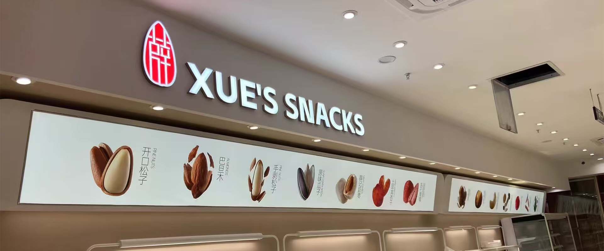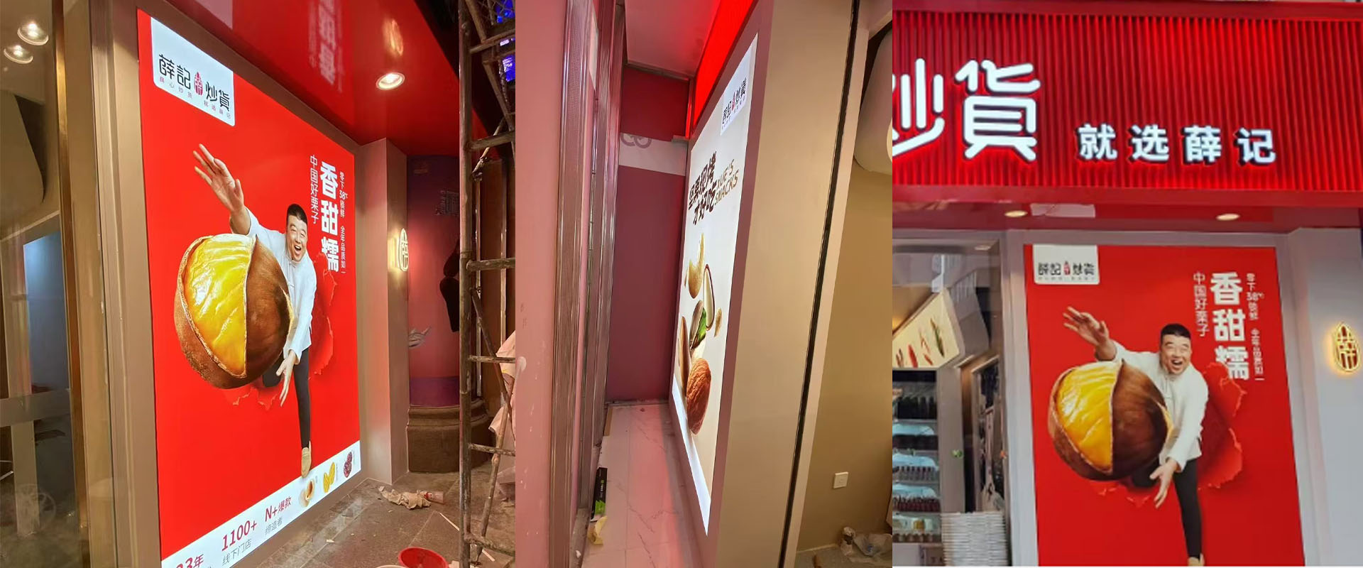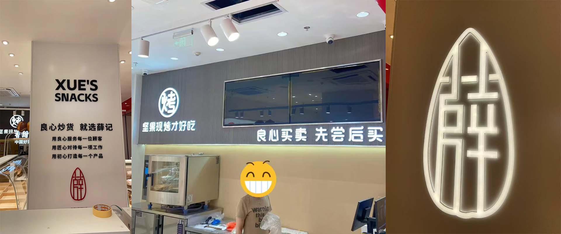 薛记炒货在柳州开了两家店,一是万象城店,二是五星店,两个店的广告都是我们制作的。